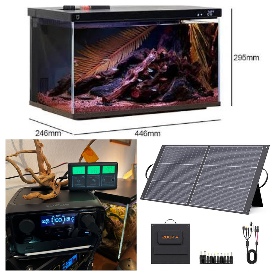 S1 is a nano smart fish tank with temperature, auto feeder, pump control, light and ambiance tweak, all controllable through an app and recharing once every 2 days on a 500X power station and a 200W solar panel
